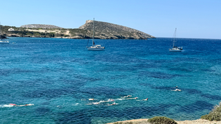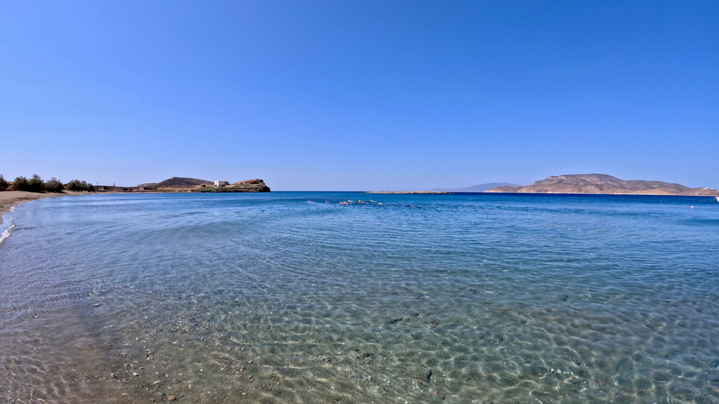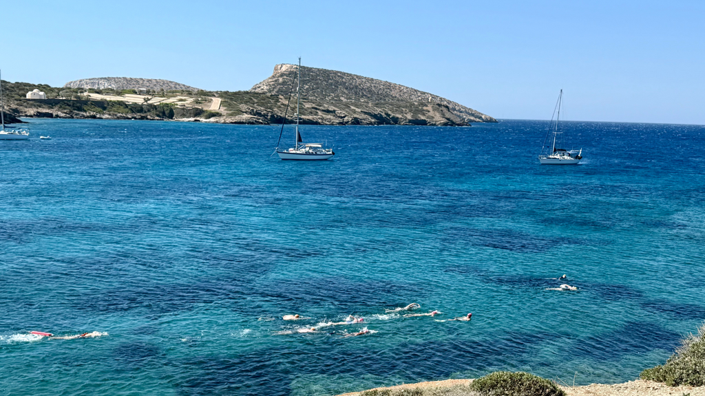 On clear days, spot the majestic peak of Mount Zeus on Naxos rising above the horizon as you swim.